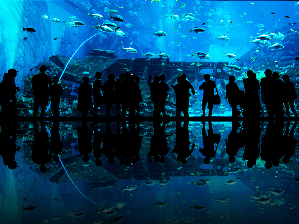 【景点介绍】迪拜购物中心水族馆位于位于全球最高塔“哈利法塔”地下的大型购物中心迪拜商场,是号称全球之最的水族馆,2008年11月开幕。水族馆观光廊长51米、宽20米、高11米,蓄水量在1000万升左右,养着包括鲨鱼、黄貂鱼等大约3.3万种水生物。另外,水族馆号称拥有世界上面积最大的丙烯酸观光隔离板。