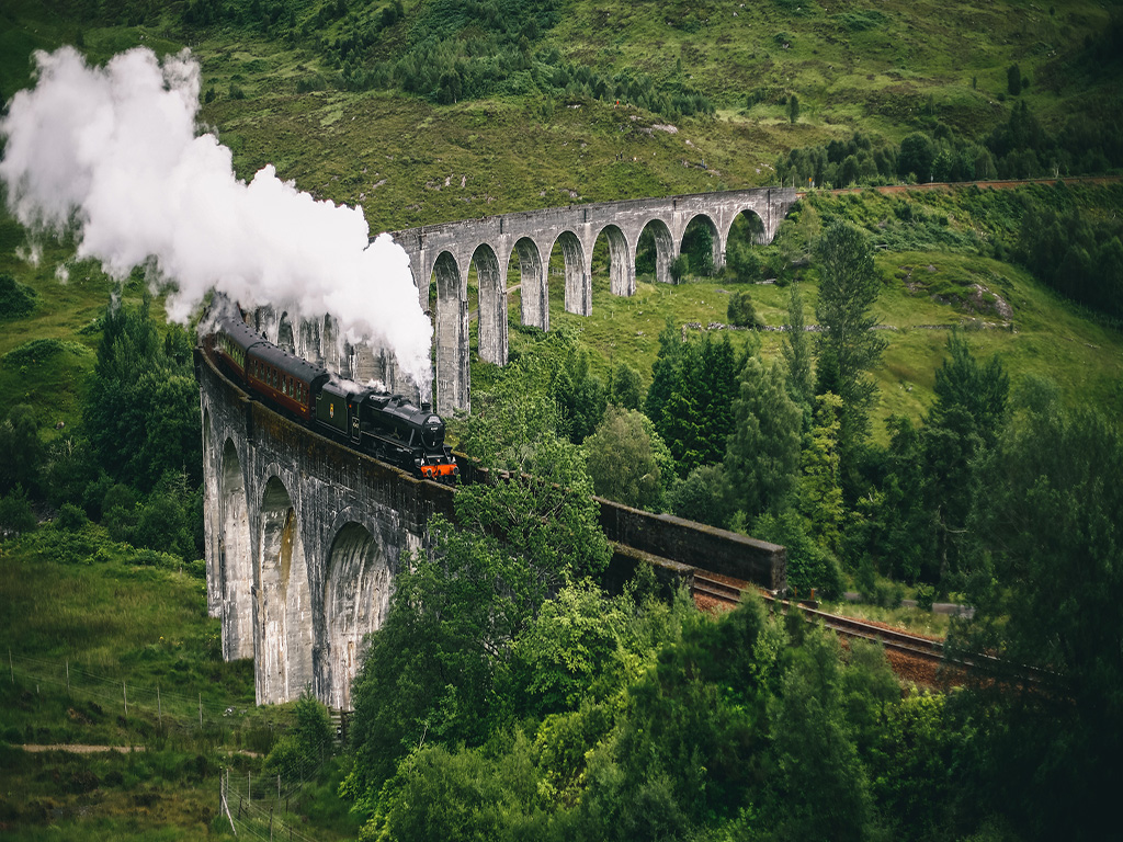 而转身远眺,则是藏身于景色壮美的苏格兰高地的格伦芬南高架桥Glenfinnan Viaduct,长长的石拱桥上,吐着白气的火车在辽阔的原野与树丛间呼啸而过,哈利波特与小魔法师们坐在里面,驶向希望的港湾——霍格沃茨。电影中这重要的一幕就是在这座深藏在山里的高架桥,它吸引着来自世界各地的波特迷们前来朝拜。