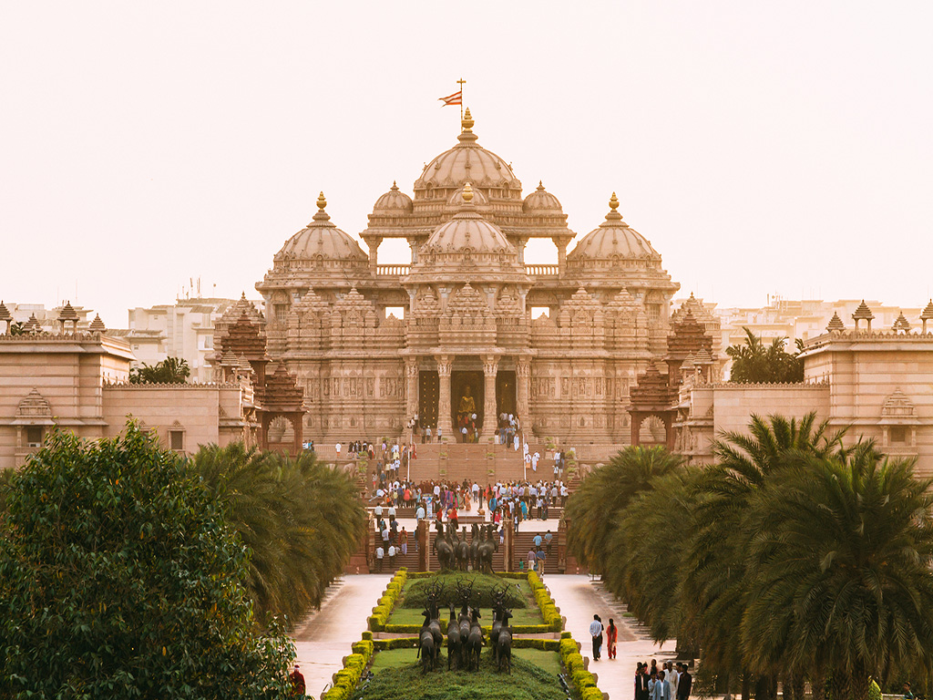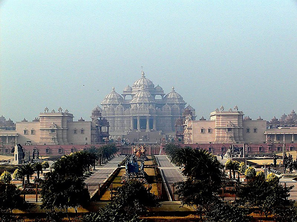 【景点介绍】新德里亚穆那河畔,占地100公顷。该庙由11,000名工匠耗时五年建造,于2005年11月落成。全部工程耗资20亿卢比。整个建筑由赭红砂石和白色大理石构成。主殿长113米,宽96米,高29米,有9个穹顶和239根装饰柱。主殿构造坐落于148只全尺寸大象雕像上。殿中有3米高纳拉扬镀金神像一座及2000多座印度教其它神像。主殿周围为二层柱廊环绕,柱廊内刻有印度史诗故事。神庙内绿茵遍地,布满莲花状水池。该庙大量采用高清电影、电动机械及声光效果等现代技术。游客还可观看引见纳拉扬的影片和乘小船阅读印度文化展。该寺庙被以为是迄今为止印度最大的神庙。